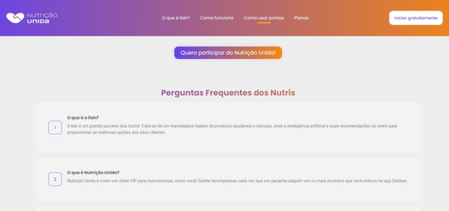 Em resumo, a landing page para nutricionistas foi projetada com cuidado e estratégia para oferecer uma experiência envolvente, informativa e persuasiva, com foco em incentivar a participação por meio do programa de pontos exclusivo.